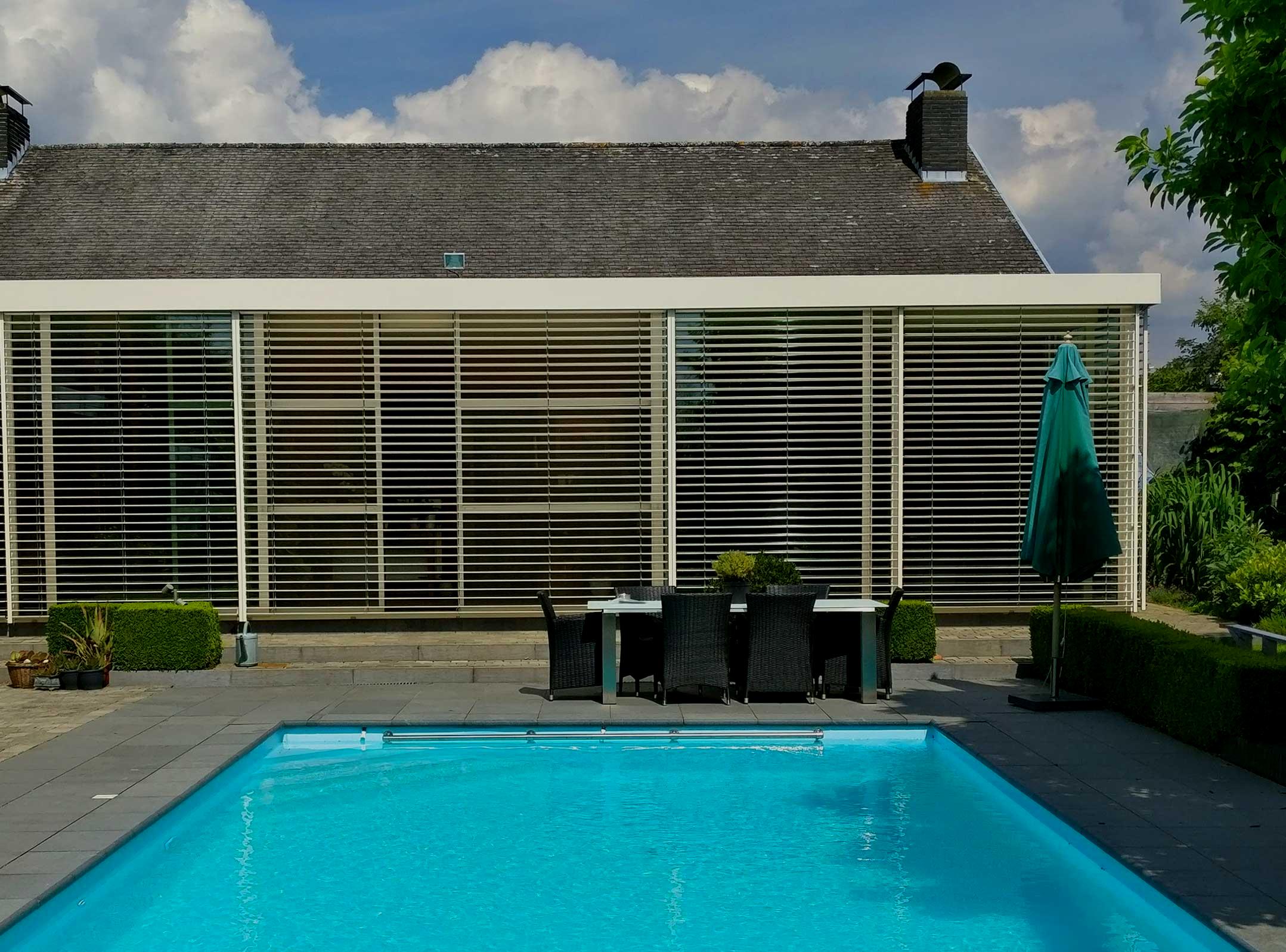 Nos brise-soleil orientables allient esthétique et fonctionnalité. Cette solution innovante permet de limiter la lumière et la chaleur incidentes. Une protection parfaite de l’intimité, à tout moment de la journée. Grâce à notre vaste choix de lames et aux nombreuses variantes de montage en aluminium de qualité, le style du bâtiment est mis en valeur. Parfait pour les logements, les immeubles de bureau et les établissements de restauration.