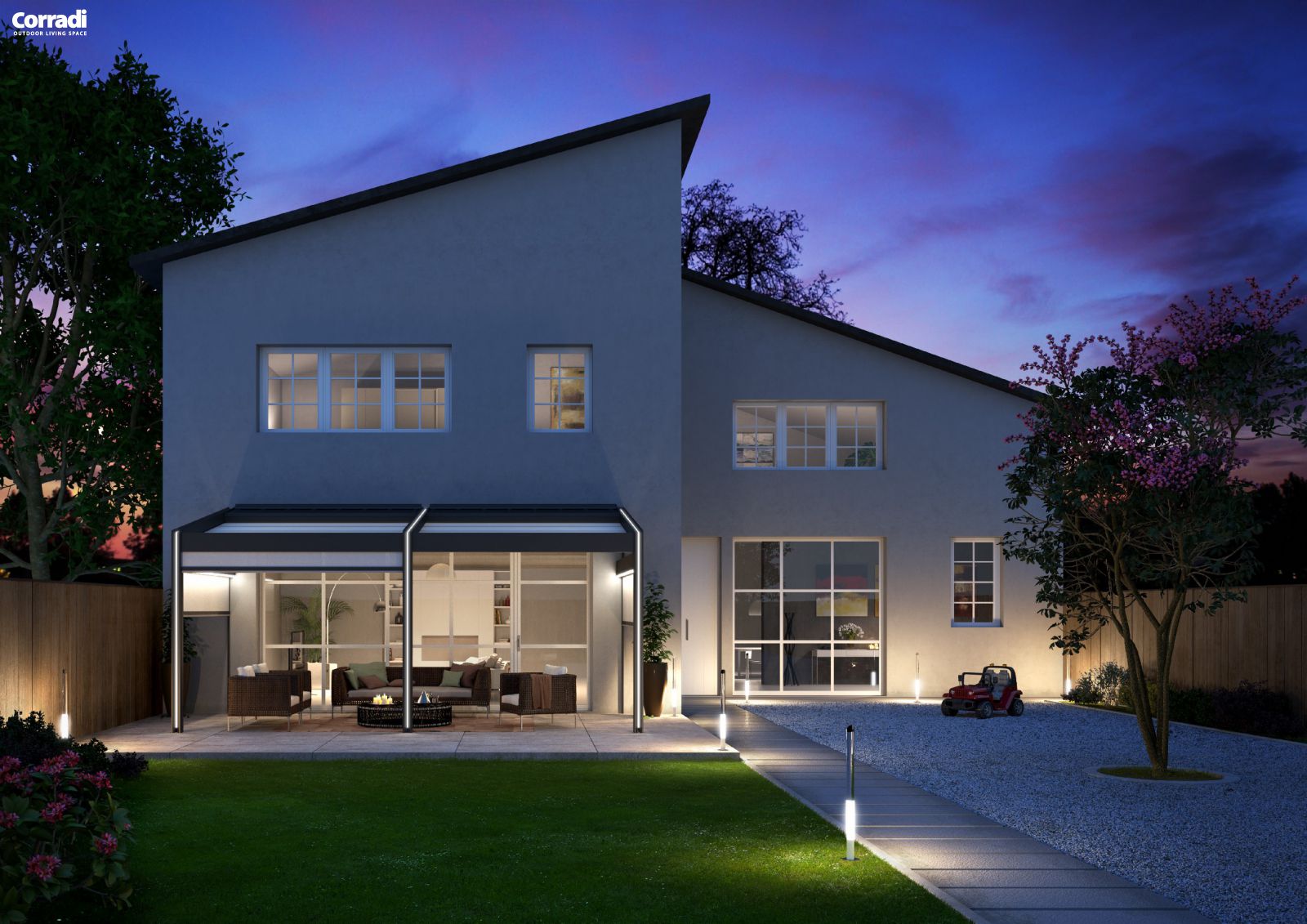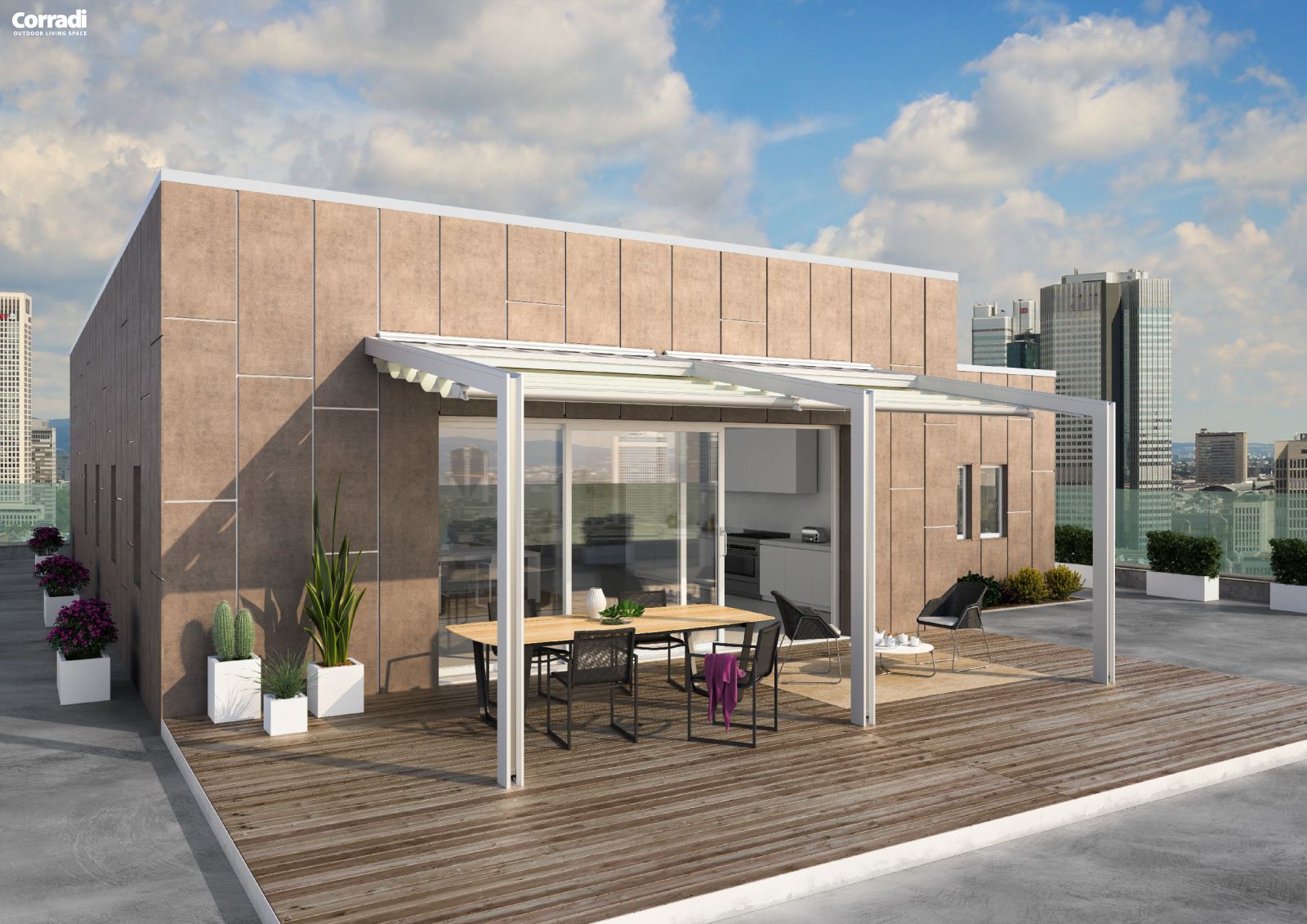 L’imperméabilité à l’eau est assurée par les solutions techniques déjà prévues sur les autres produits de la gamme Pergotenda®, dont la gouttière mobile, une exclusivité brevetée Corradi.