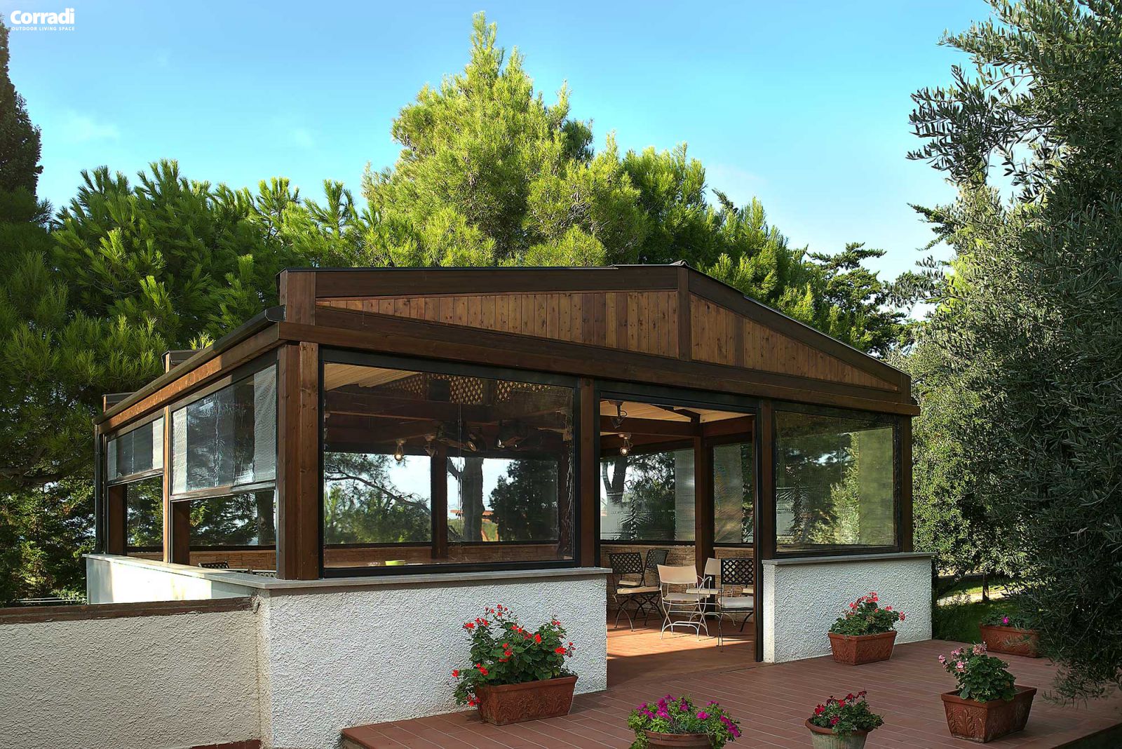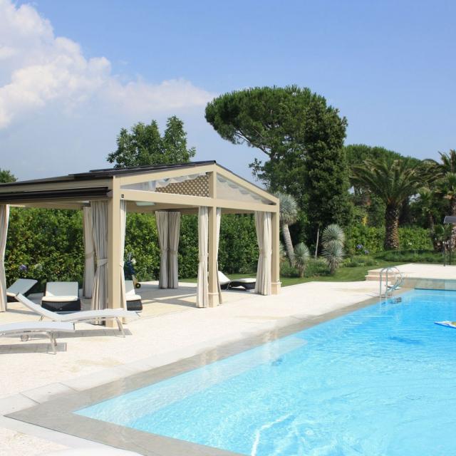 Pergotenda® 120, autoportante en bois, se caractérise par sa capacité à couvrir de grandes surfaces sans la nécessité de poteaux intermédiaires.